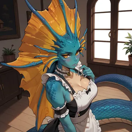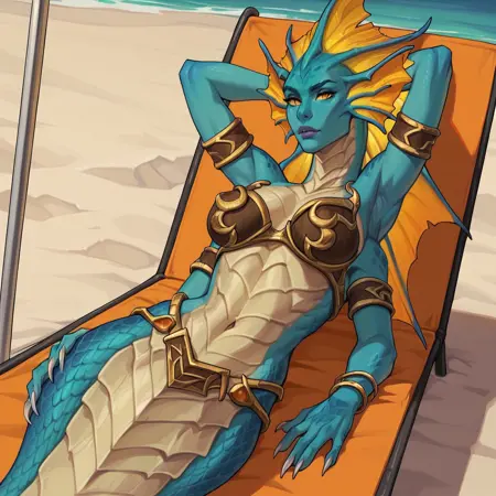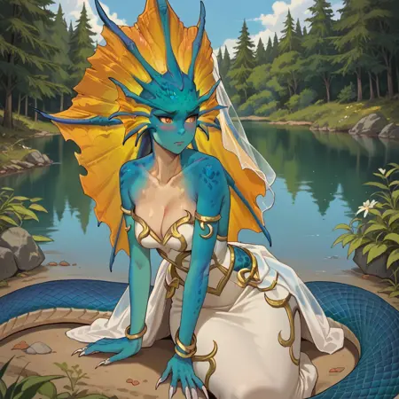 娜迦女妖,女性,娜迦,鳞片,人形,爪子,头部鳍,耳鳍,水生,蛇尾,蓝色皮肤,黄色鳍