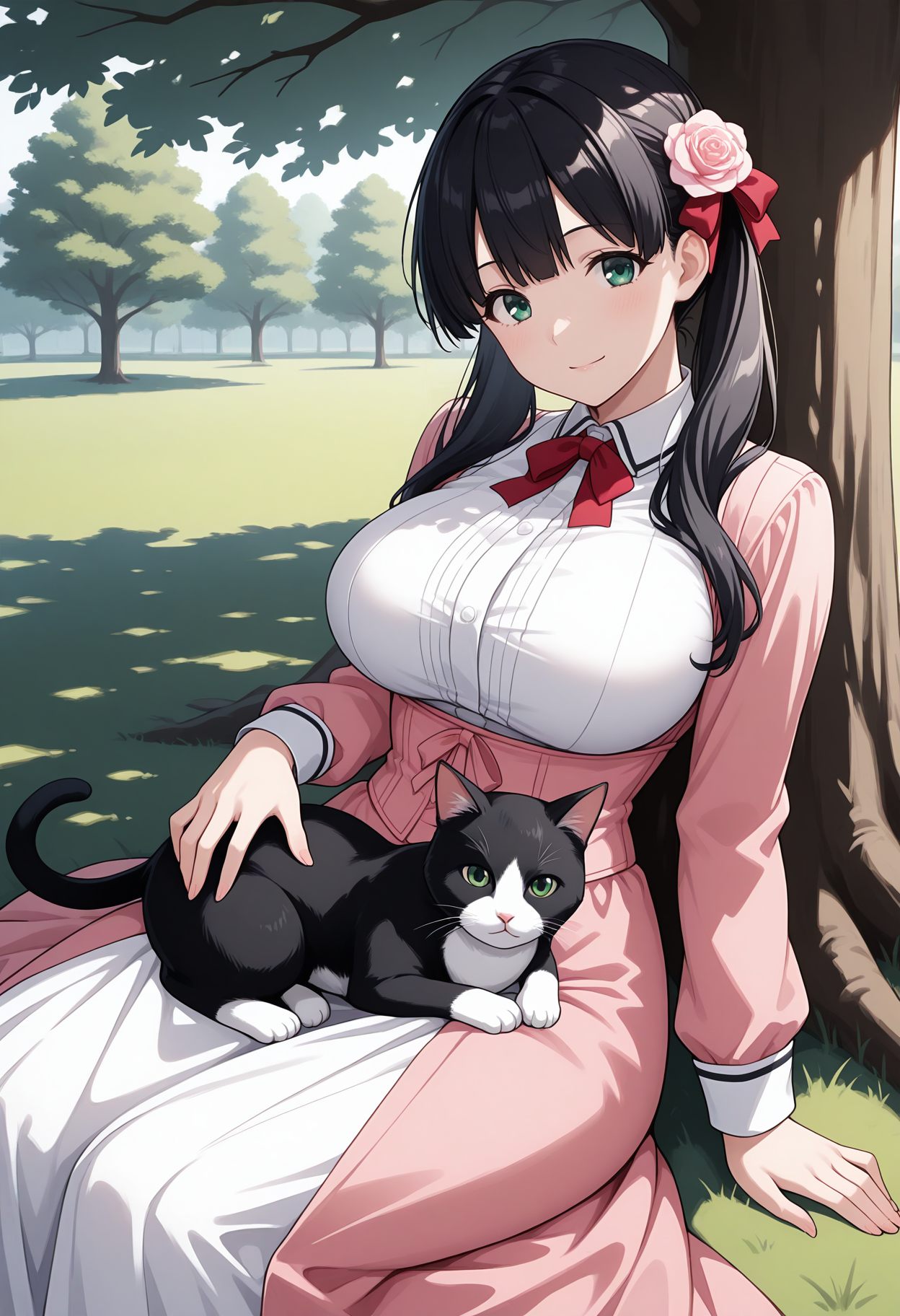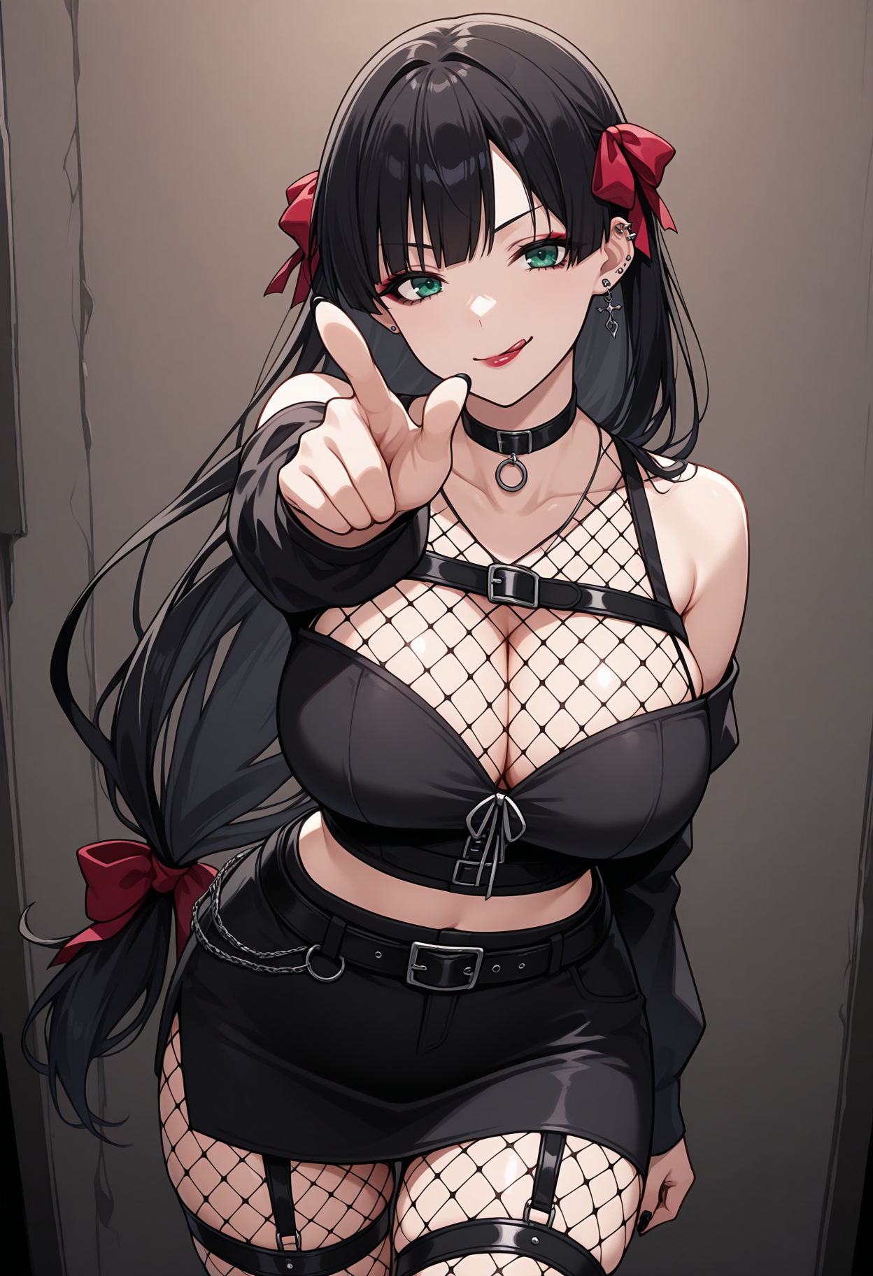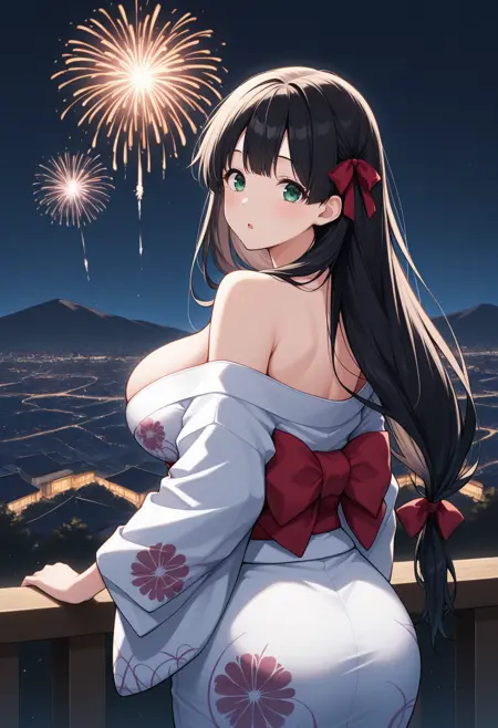 1girl, solo, green eyes, long hair, black hair, low-tied long hair, hair ribbon, huge breasts,