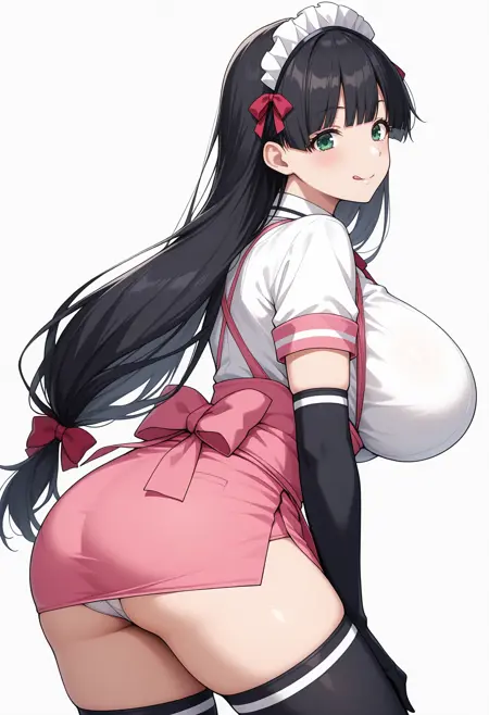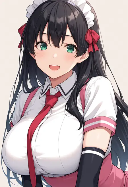 1girl, solo, green eyes, long hair, black hair, low-tied long hair, hair ribbon, huge breasts, maid headdress, white shirt, underbust, elbow gloves, black gloves, pink apron, red necktie, black thighhighs,