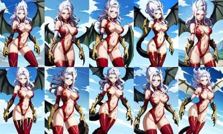 衣装2 (非常に不安定です)bbmira、モンスターガール、ロングヘア、浮遊する髪、尖った耳、翼、尾、バストライン、赤いレオタード、中央開閉、手袋、爪、へそ、タイツ、太ももブーツ