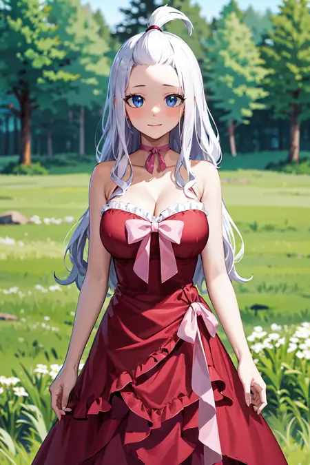 衣装1aamira、ロングヘア、前髪を後ろに固定、ツインテール、額、チョーカー、肩出し、バストライン、赤いドレス、フリル付きドレス、リボン、ノースリーブ