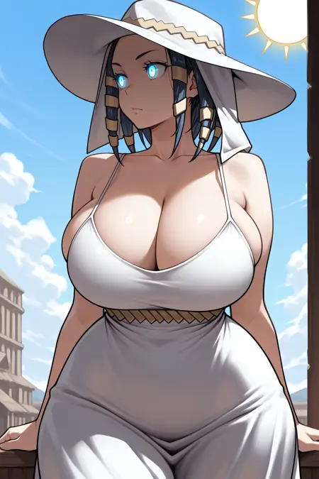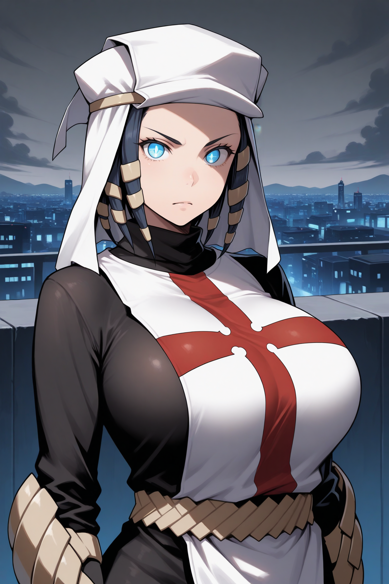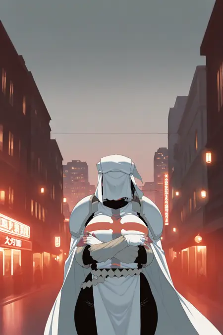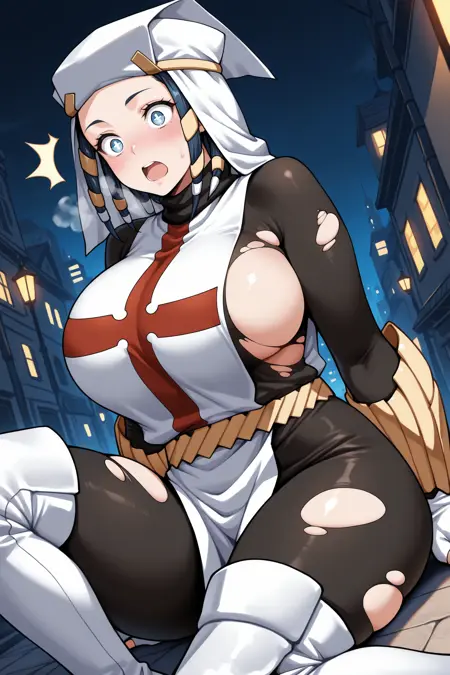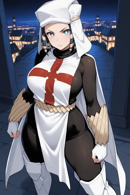 彼女の典型的な外見には、「黒いボディスーツ、赤と白のタバード、十字型タバード、白い手袋、指なし手袋、腕当て、ベルト、白いブーツ、太ももブーツ」を追加してください。