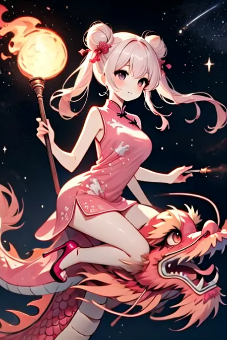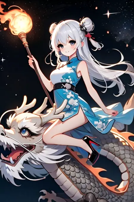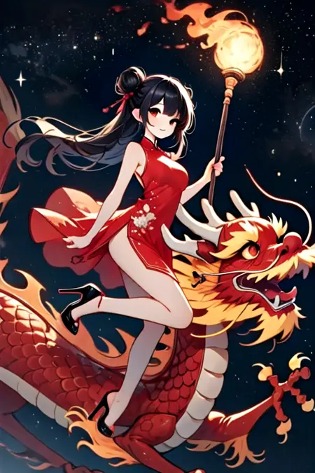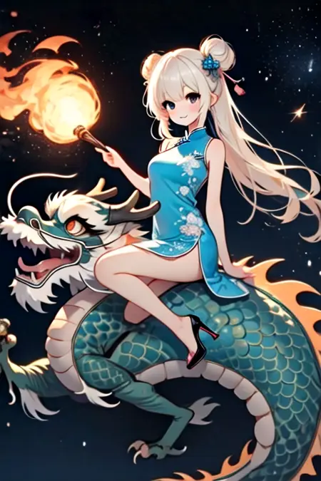 Note: Training the traditional dragon dance is too difficult for me, so I settled for the next best thing, a girl riding on a dragon and holding a burning dragon ball. SD 1.5 is not a very stable version. The fireball and the torch pole are not very obedient, and the success rate is less than one-third. And you can't switch scenes, so I recommend using the pony version. It is not recommended to add "eastern dragon" unless you want the girl to have dragon horns. (SD 1.5)