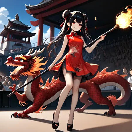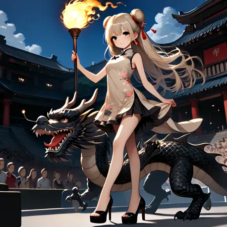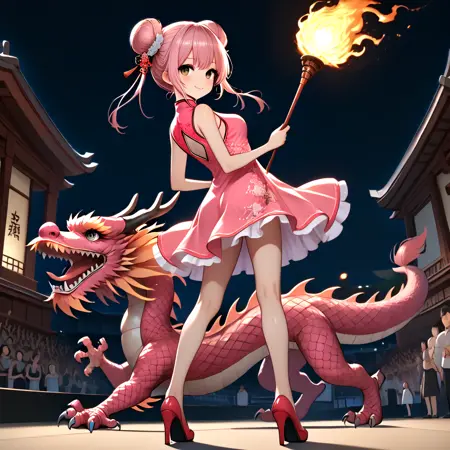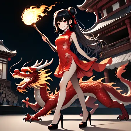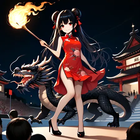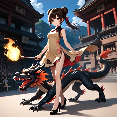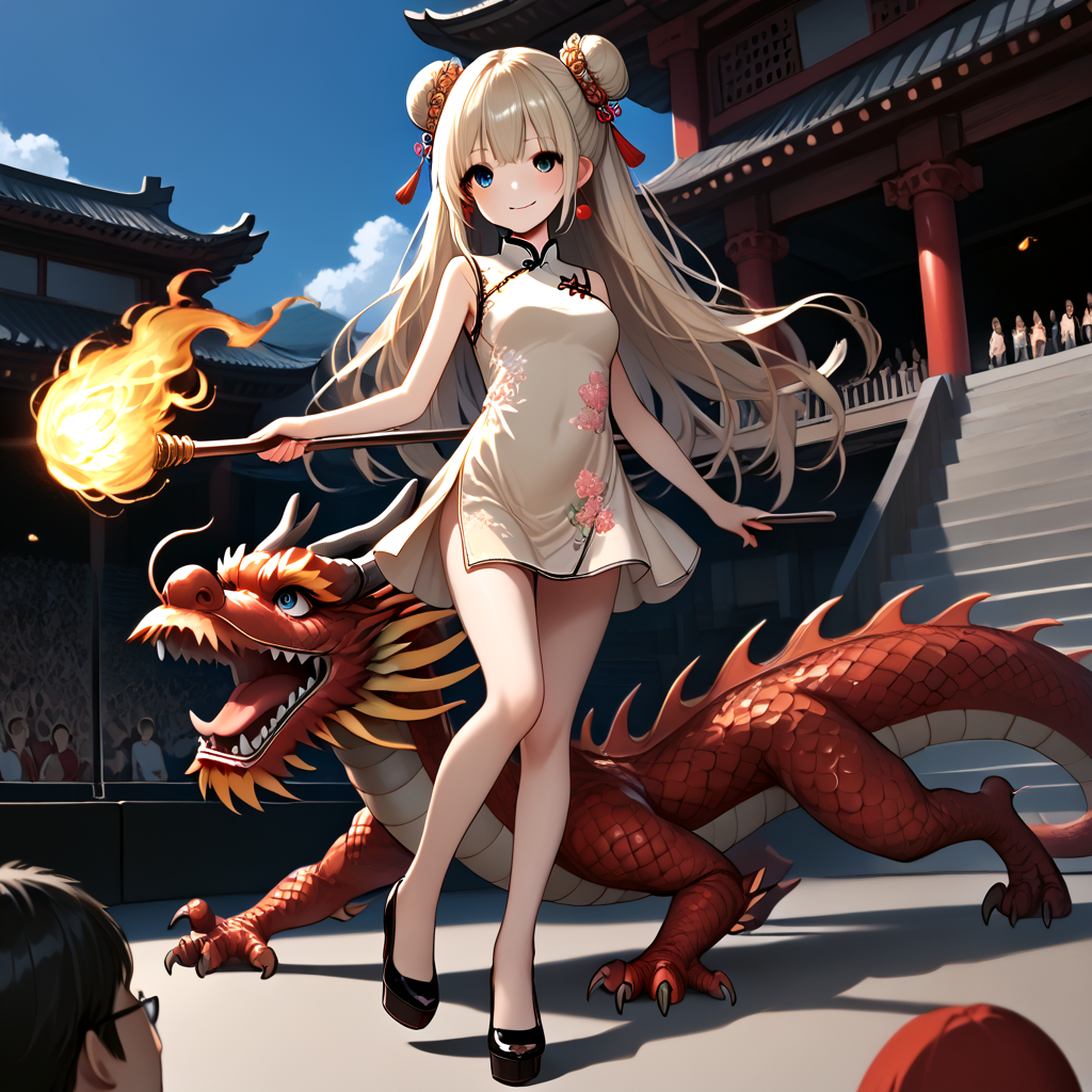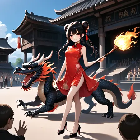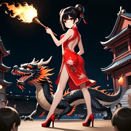 Note: Training the traditional dragon dance is too difficult for me, so I settled for the next best thing, a girl riding on a dragon and holding a burning dragon ball. SD 1.5 is not a very stable version. The fireball and the torch pole are not very obedient, and the success rate is less than one-third. And you can't switch scenes, so I recommend using the pony version. It is not recommended to add "eastern dragon" unless you want the girl to have dragon horns. (SD 1.5)