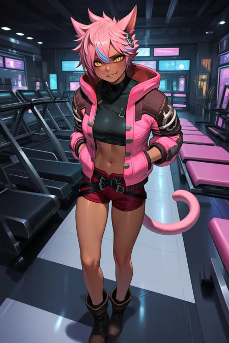 기본 복장: 핑크 재킷, 열린 재킷, 검은 크롭탑, 빨간 반바지, 벨트, 갈색 부츠