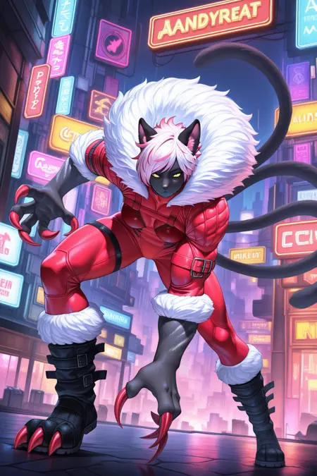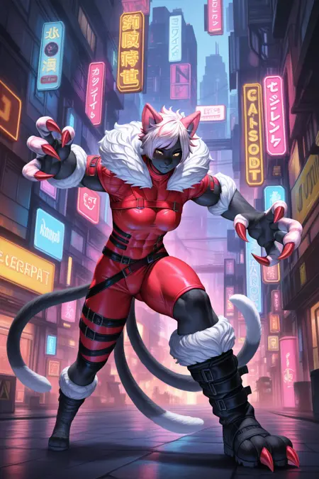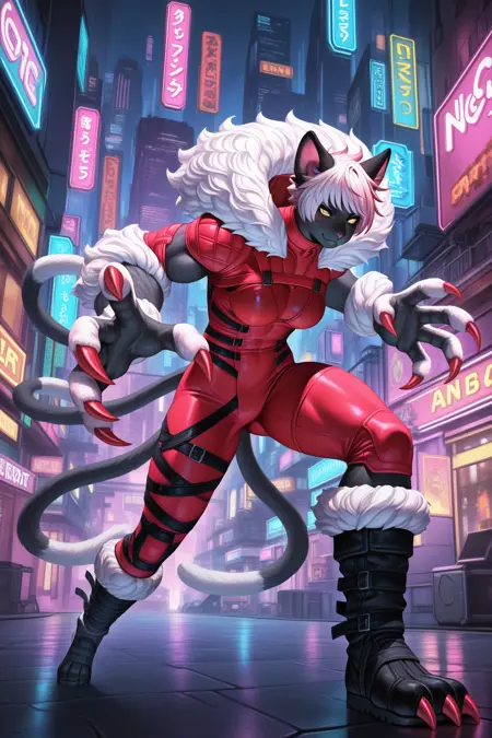 트리거 단어 및 외모 (Black Cat): yaanablackcat, 검은 피부, 검은 털, 털이 많은 여자, 노란 눈, 고양이 소녀, 고양이 입, 코, 앤트로, 고양이 발, 고양이 귀, 여러 개의 꼬리, 빨간 발톱, 긴 발톱, 빨간 바디수트, 근육질, 두꺼운 팔, 두꺼운 다리, 검은 부츠