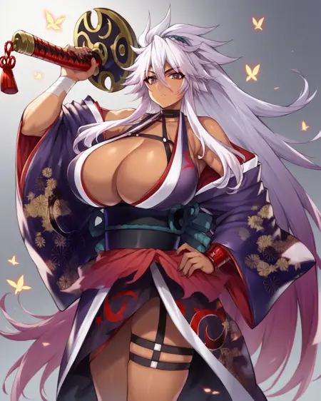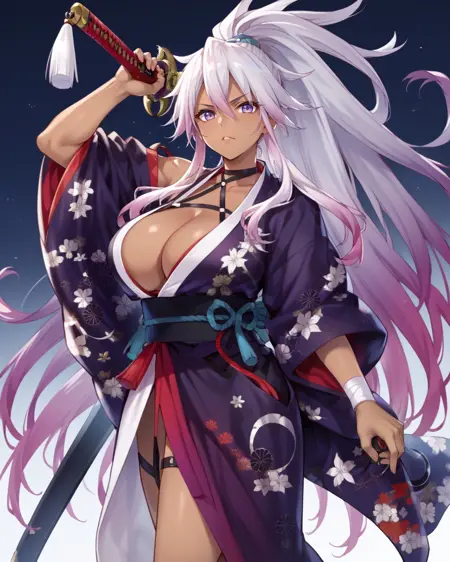 yaksha\(kyonyufantasyburst\),1girl,solo,huge breasts,standing,looking at viewer,dark skin,japanese clothes,holding weapon,very long hair,purple hair,kimono,multicolored hair,hand on own hip,gradient hair,obi,looking at viewer, grey hair,