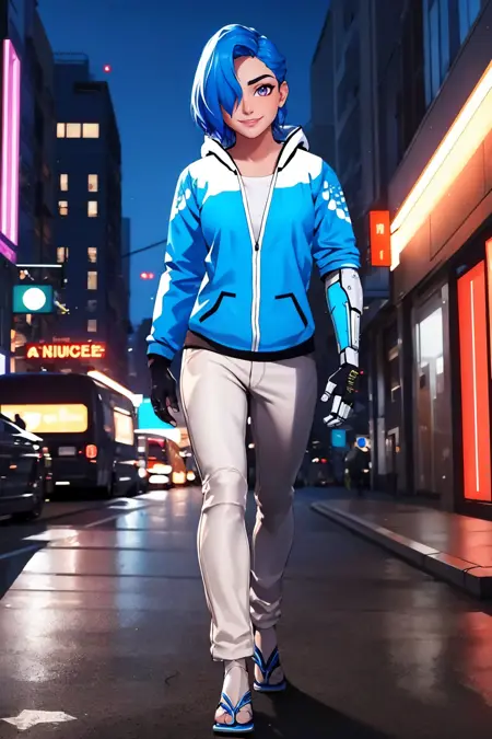 Add "hair over one eye, blue hoodie, white pants, single mechanical arm" for her typical look.