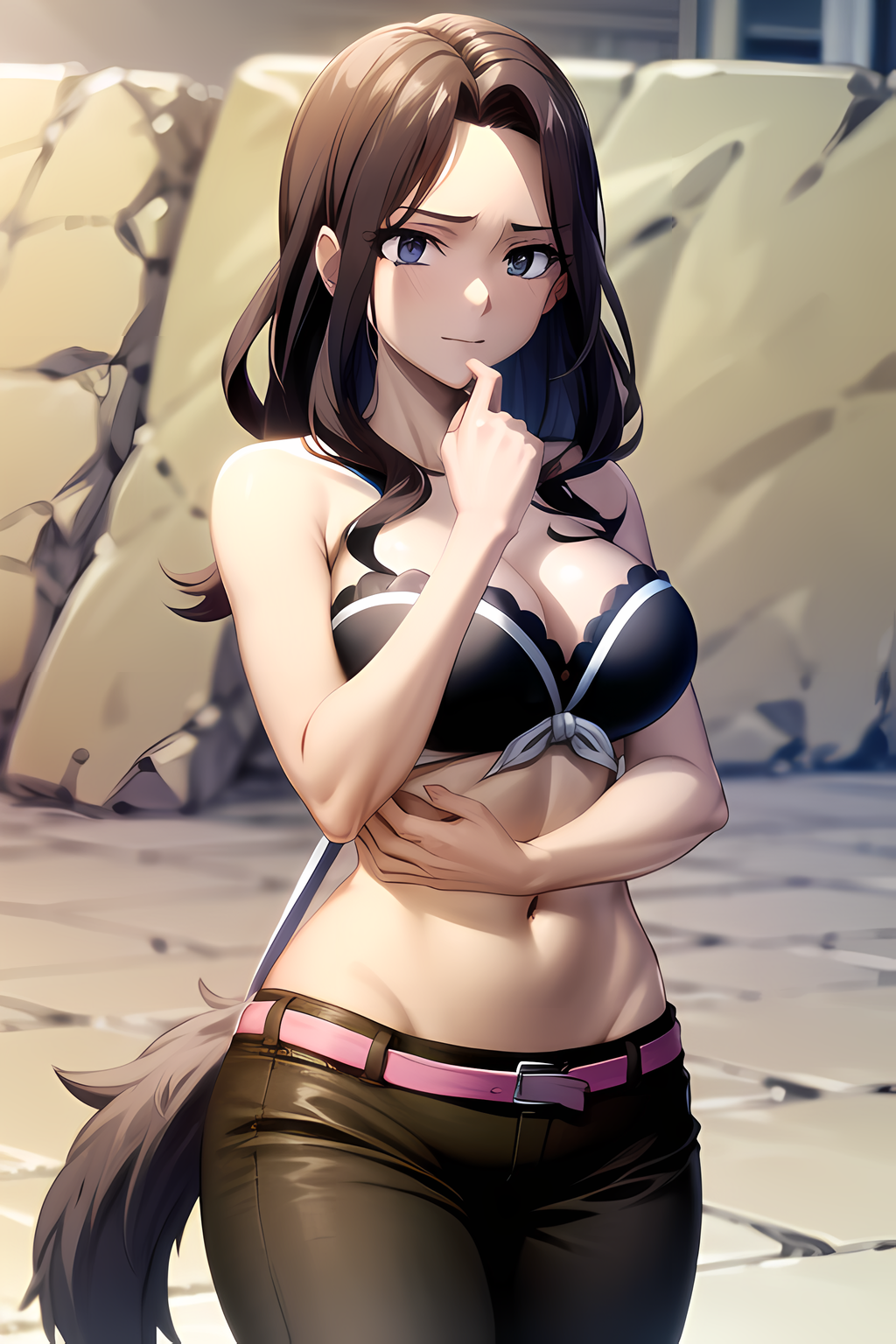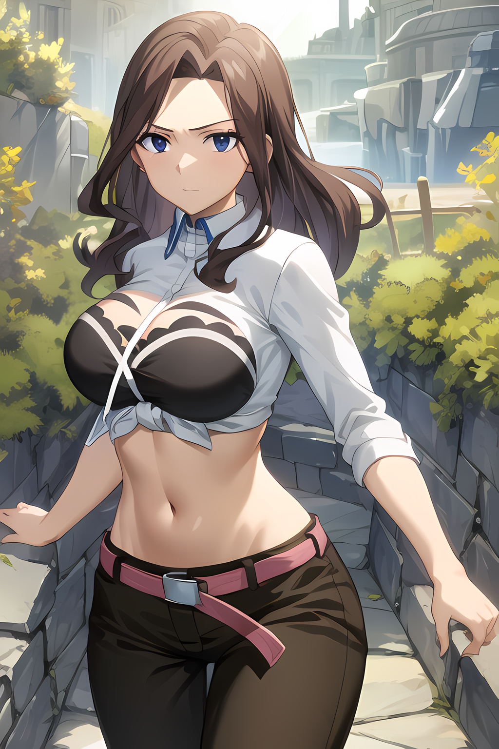 bra, tied shirt, front-tie top, pants, belt, detached collar, tattoo - 텐로우 섬 아크 옷