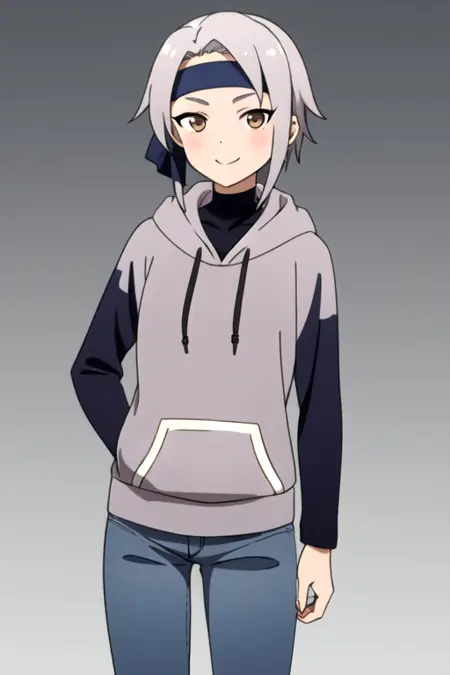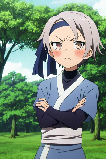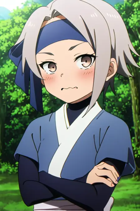 kunoichihigiri, brown eyes, gray hair, short hair, headband, blue kimono, turtle neck