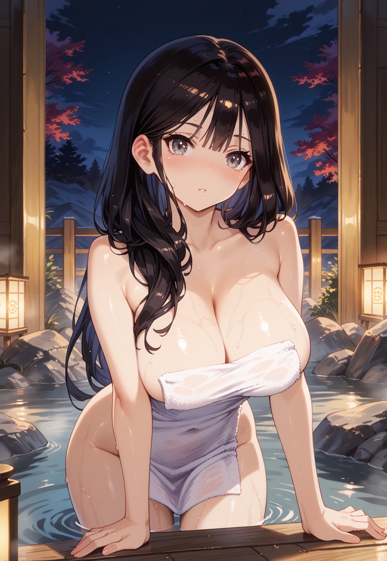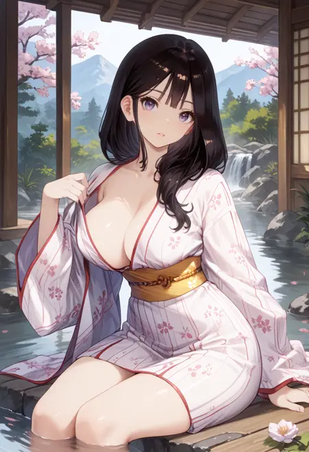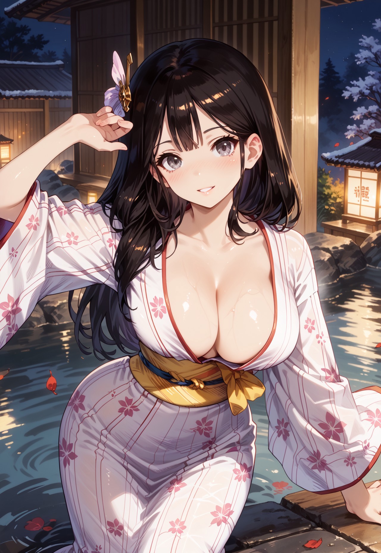 ventana-OSP、大きな胸、灰色の目、黒髪、長い髪、日本衣装、白い浴衣、ピンクの花柄、胸元、ブラなし、黄色い帯、日本の草履、