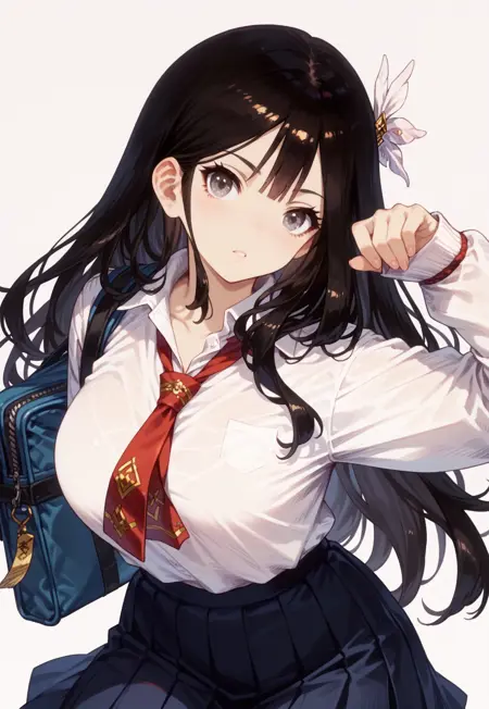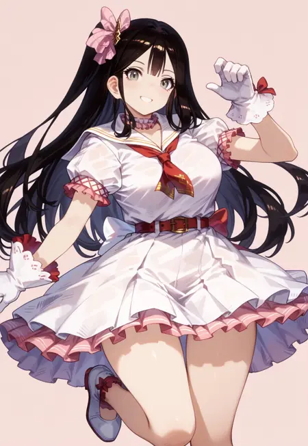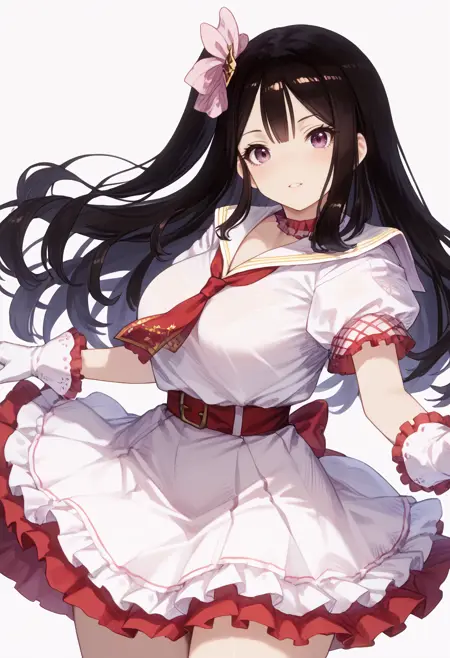 ventana-CID,丰满胸部,灰色眼睛,黑发,长发,偶像主题,单侧发饰,粉色花边项圈,水手领,红色领巾,白色蓬松短裙,花边,白色褶边手套,红色腰带蝴蝶结,褶边裙摆,红色单侧大腿蝴蝶结绳,红色脚踝带,白色鞋履,