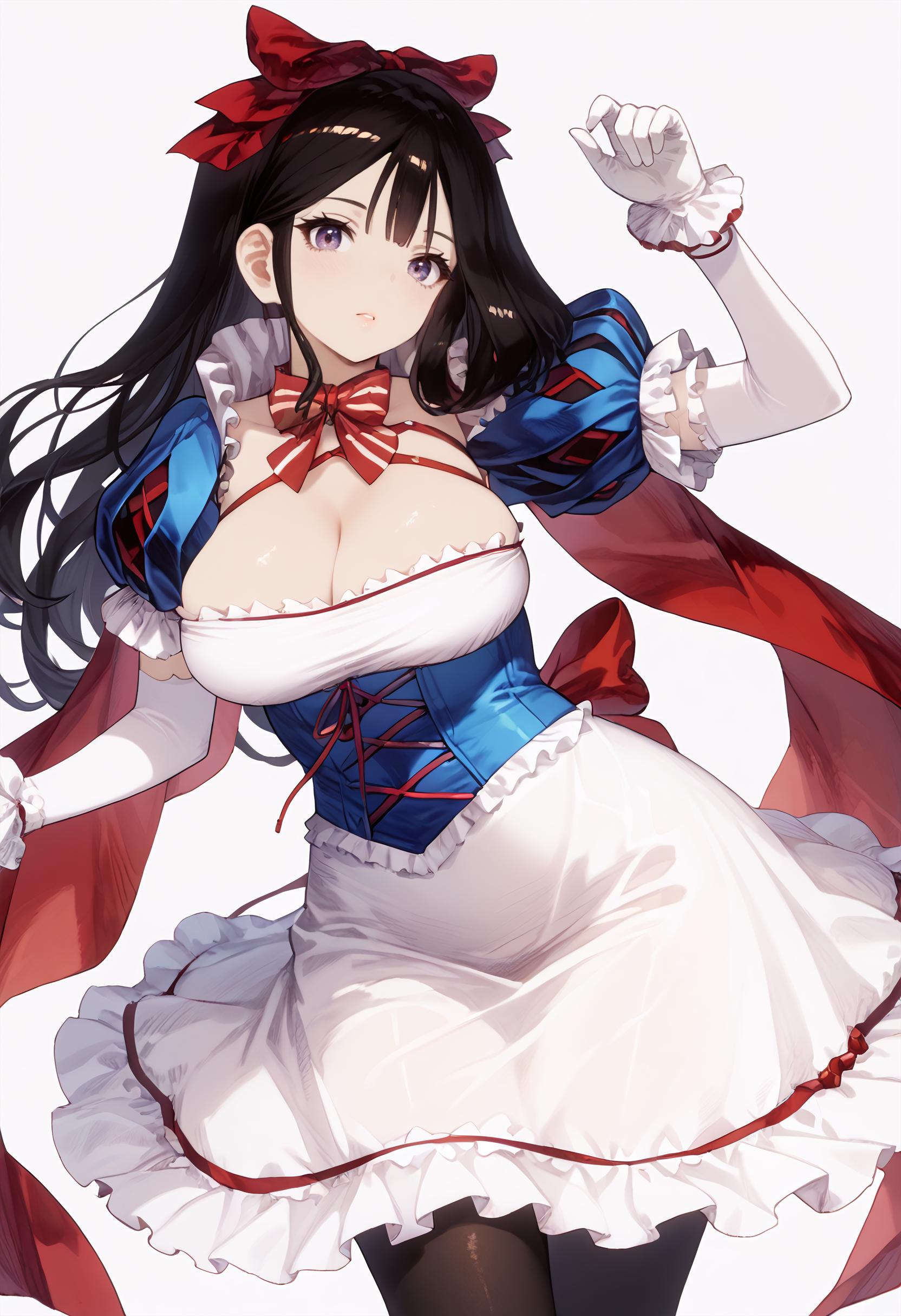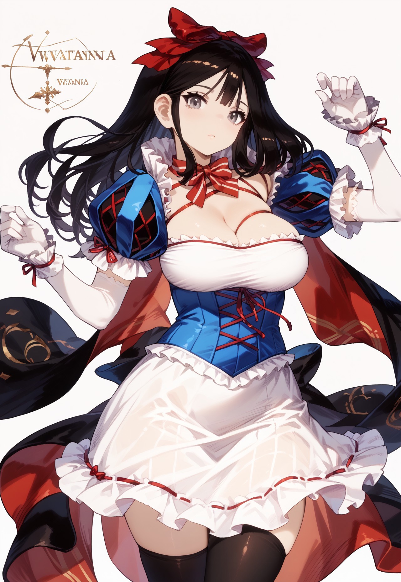 ventana-SW、大きな胸、灰色の目、黒髪、長い髪、スノーホワイトコンセプト、赤い髪リボン、ストライプのネクタイ、白いドレス、胸元、青いコルセット、赤いリボン、赤い紐、青いふわふわの短い袖、白い肘手袋、白い手袋、白いフリル、黒いタイツ、赤いハイヒール、