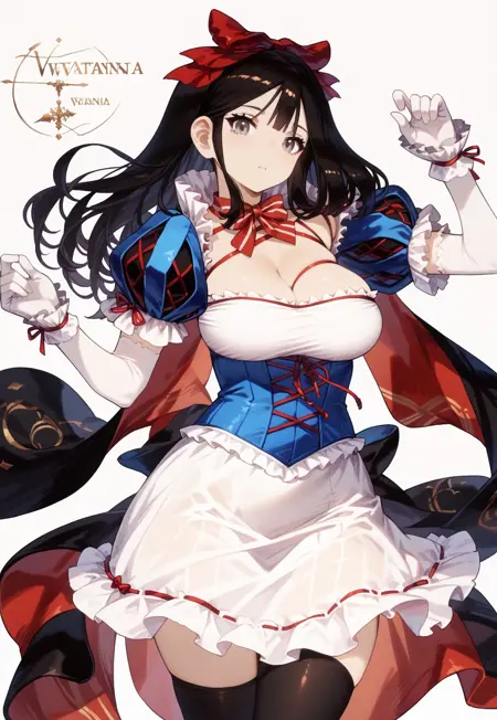 ventana-SW,丰满胸部,灰色眼睛,黑发,长发,白雪公主主题,红色发带,条纹领结,白色连衣裙,乳沟,蓝色束腰,红色丝带,红色细绳,蓝色蓬松短袖,白色肘部手套,白色手套,白色花边,黑色过膝袜,红色高跟鞋,