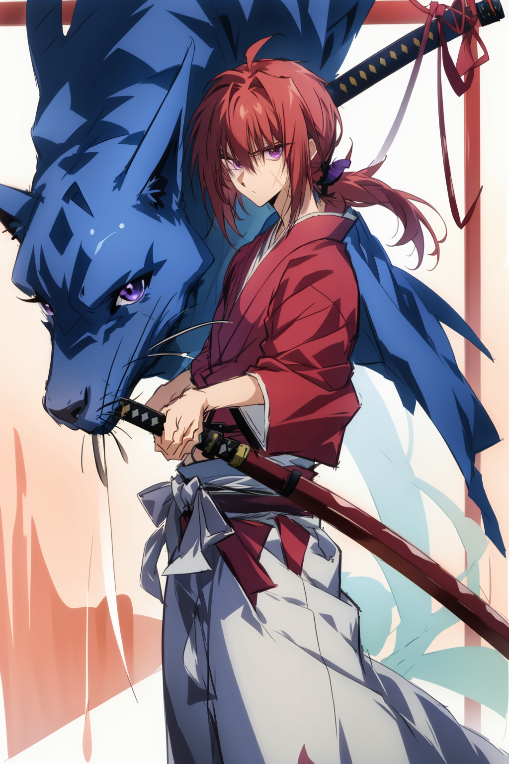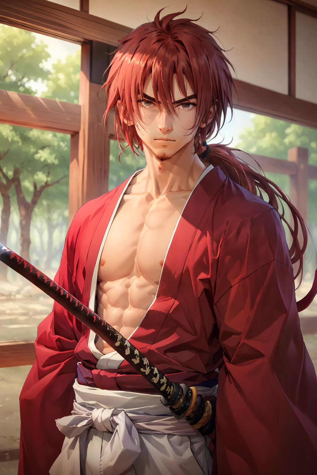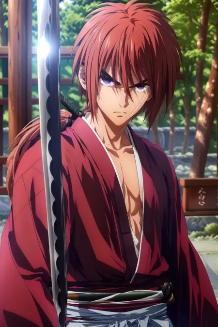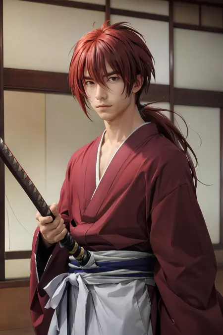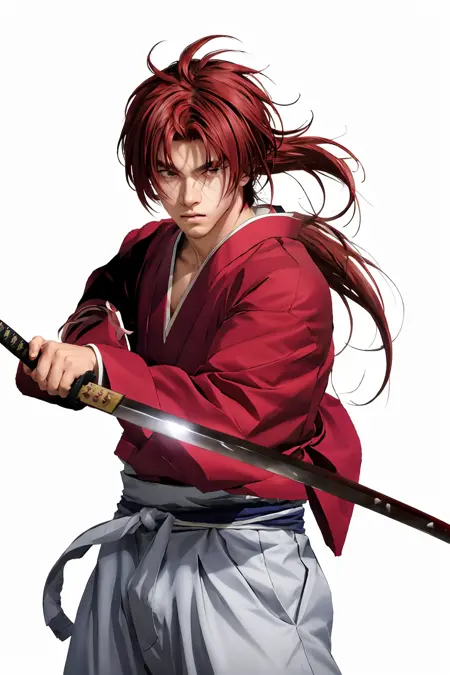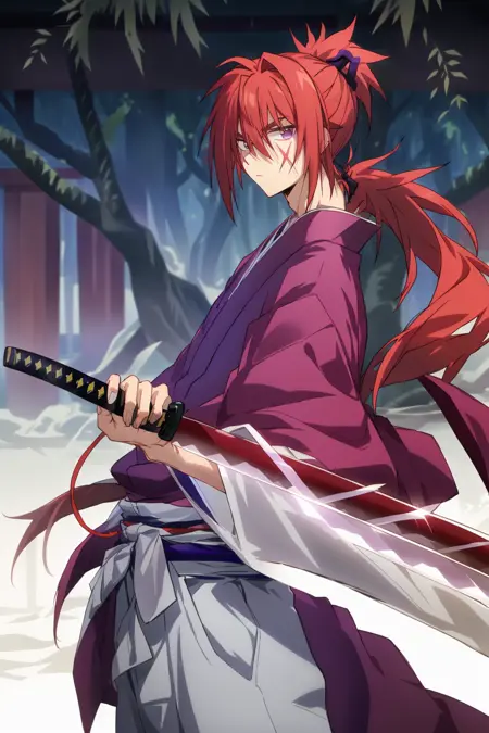 (realistic:1.5), SamuraiXQuiron man, solo, long hair, 1boy, ponytail, male focus, red hair, japanese clothes, kimono, scar, katana, sheath, scar on face, samurai, lora:quiron_SamuraiX_v1_Lora:0.67
