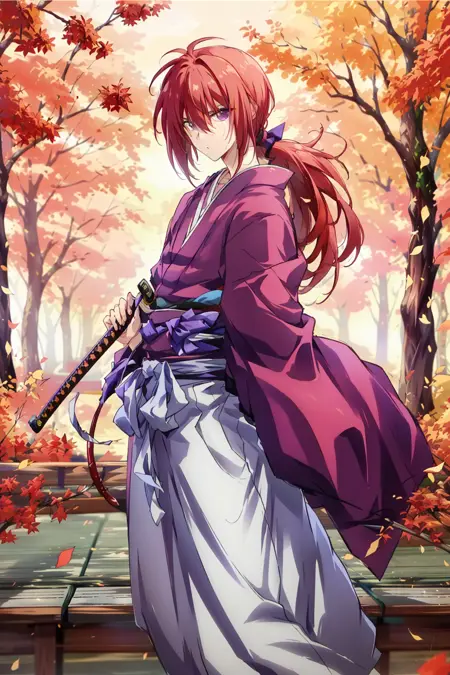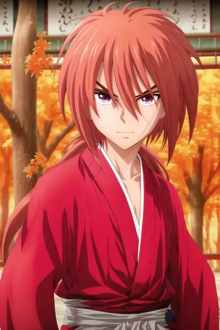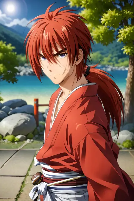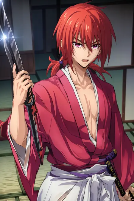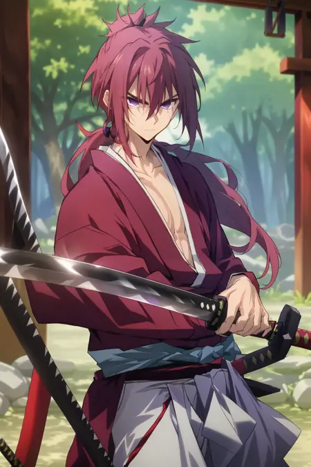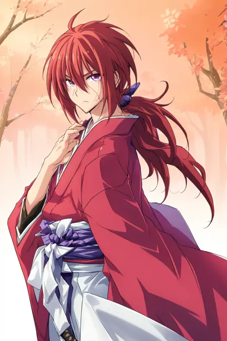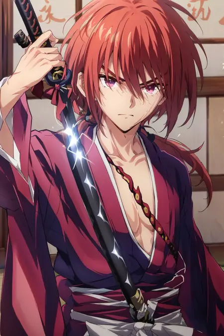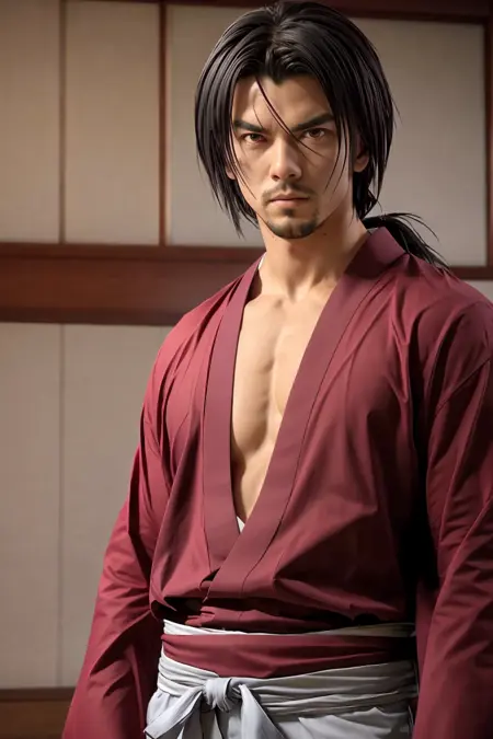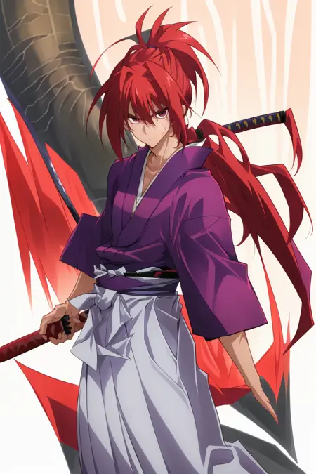 (realistic:1.5), SamuraiXQuiron man, solo, long hair, 1boy, ponytail, male focus, red hair, japanese clothes, kimono, scar, katana, sheath, scar on face, samurai, lora:quiron_SamuraiX_v1_Lora:0.67
