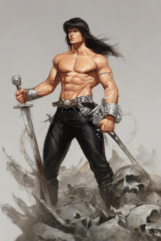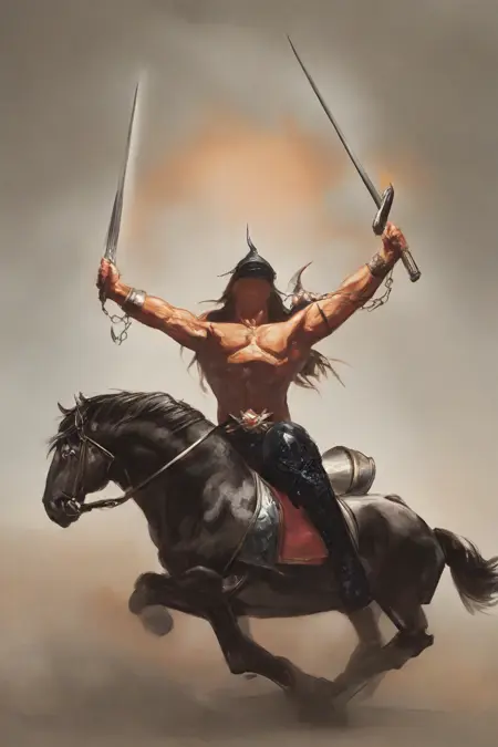 사용할 예시 트리거 단어: 근육질, 빛나는, 체인, 상의 벗은 남성, 두개골, 해머, 번개, 불, 무기, 복근, 빛나는 눈, 스파이크, 여자, 검, 레트로 아트 스타일, 피, 도끼, 죽음, 악마, 시체, 보석, 목걸이, 무기 들고 있음, 창, 말 타기, 말 등에 앉음, 바위, 녹은 바위, 들고 있음, 양손 무기, 여러 여자, 벌거벗은, 여러 남자, 날개, 팔찌, 몬스터 걸, 뱀, 판타지, 드래곤, 해머, 번개, 시체, 채찍, 심어진, 심어진 검, 망치, 꼬리, 뿔, 날카로운 귀, 갑옷, 팔을 위로 들어 올림, 데몬걸, 창, 천사, 마법