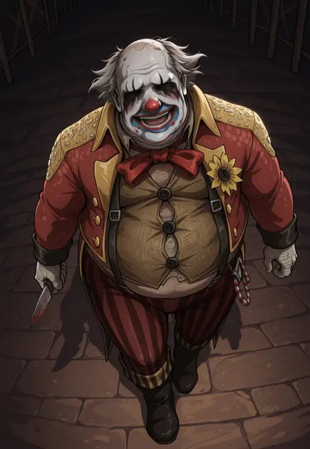 1boy, c1own, clown, fat, no eyes, painted face, grey hair, red bow, jacket, bandaged gloves, pants, boots,