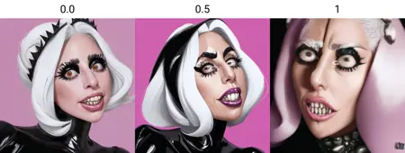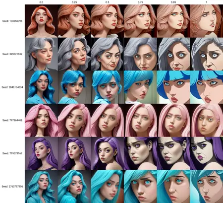 在高权重下,模型几乎总是会返回相同的面部角度,但这是不可避免的,因为训练数据集相对较小。