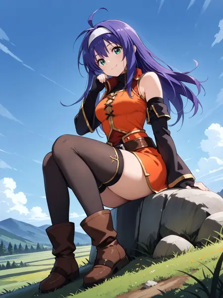 为她的典型造型添加:"白色发带、可拆卸袖子、露指手套、橙色连衣裙、无袖高领、黑色上衣、腰带、过膝袜、靴子"。(Radiant Dawn_v1.0)