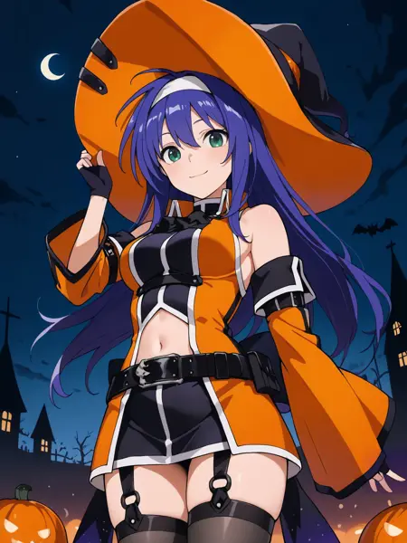 为她的万圣节造型添加:"女巫帽、白色发带、可拆卸袖子、露指手套、连衣裙、腰带、露脐设计、吊袜带、过膝袜、靴子"。(Halloween_v1.0)