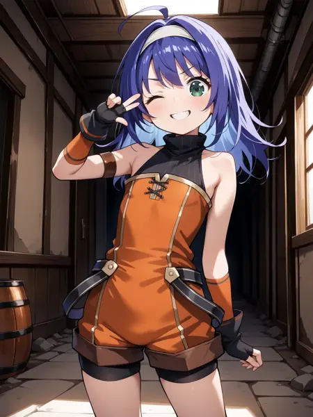그녀의 전형적인 외모를 위해 "white hairband,detached sleeves,fingerless gloves,orange dress,sleeveless turtleneck,black shirt,belt,thighhighs,boots"를 추가하세요. (Radiant Dawn_v1.0)