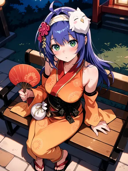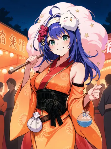 Add "hairband,mask on head,hair ornament,orange kimono,detached sleeves,sash,pouch,sandals" for her summer festival look.(Yukata_v1.0)