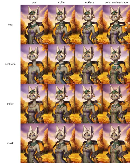 主要的标记元素是领圈/项链、面具和漂浮的围巾。附注:请使用负面提示,如果不使用,面具容易残留。