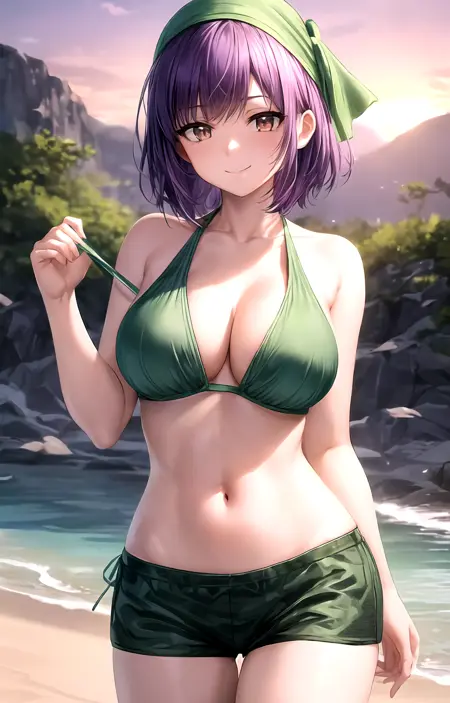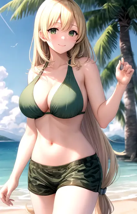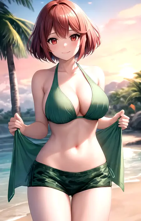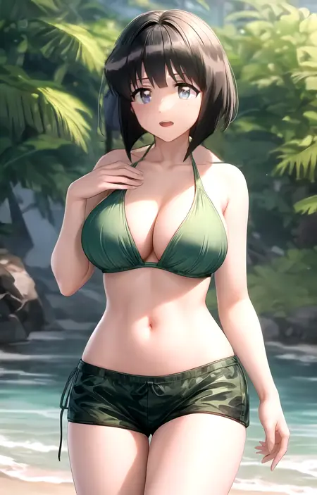 - Activation tag: yukari_camo, use with camouflage, green bikini, bikini shorts, short shorts, and green shorts.