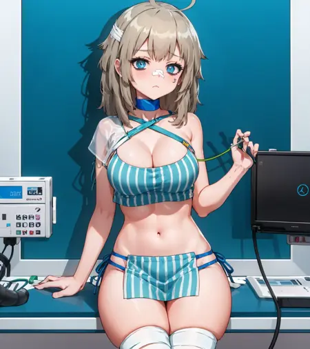 AA12Lind,露乳沟,露腰,腿部缠绷带,蓝色条纹装,白色颈圈,鼻梁贴创可贴,胯部遮帘,露肩