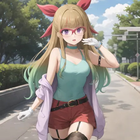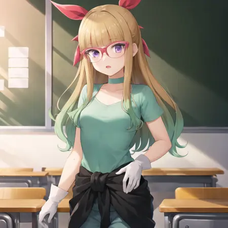 基本の衣装:ohdoyuamu, 1girl, solo, long hair, green hair, blonde hair, brown hair, bow, ribbon, purple eyes, hair ribbon, hair bow, glasses, green choker, white gloves, blunt bangs, red-framed eyewear, jacket, green shirt, short sleeves, white jacket, clothes around waist, orange pants