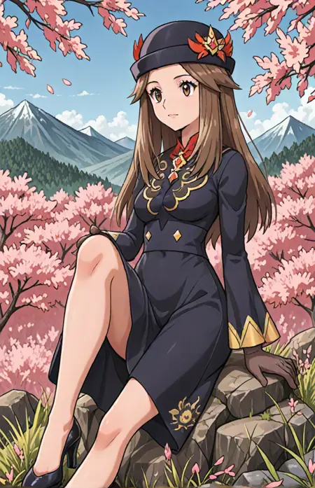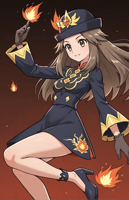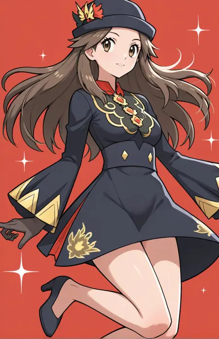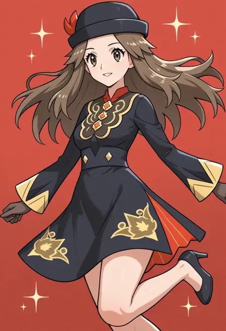 black_headwear、hat_ornament、black_dress、buttons、long_sleeves、black_gloves、shoes、black_footwear、high_heels