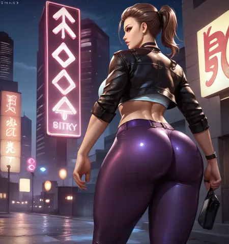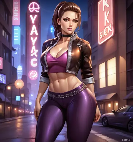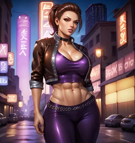 shaundi, one woman, normal mature face, brown eyes, cropped jacket, close up, bust shot, leather, leather jacket, brown hair, ponytail, purple cloths, eyeliner, abs, choker, pants, high heels, symmetrical face, (brown eyes),