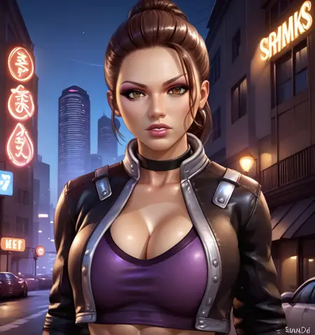 shaundi,一名女性,正常成熟面孔,棕色眼睛,短款夹克,特写,胸像,皮革,皮夹克,棕色头发,马尾,紫色衣物,眼线,腹肌,项圈,裤子,高跟鞋,对称脸型,(棕色眼睛)