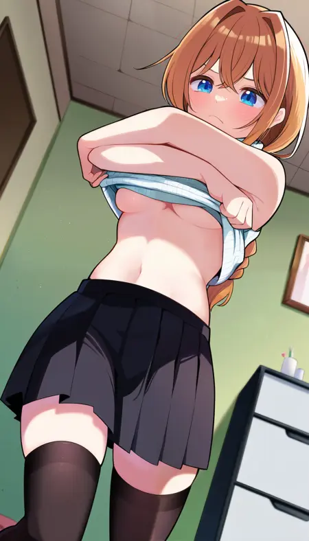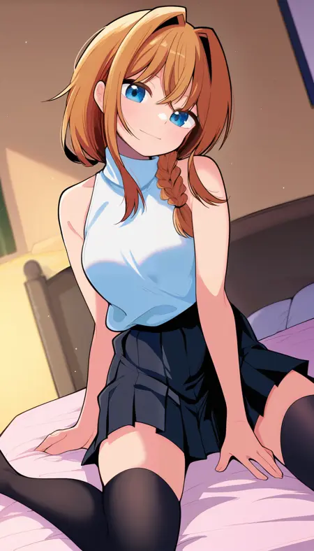 RikkaParty, 1girl, blue eyes, brown hair, long hair, braided ponytail, hair intakes, sidelocks, hair between eyes, crossed bangs, hair over shoulder, medium breasts, sleeveless sweater, turtleneck, shirt tucked in, bare shoulders, bare arms, black skirt, pleated skirt, black thighhighs, zettai ryouiki