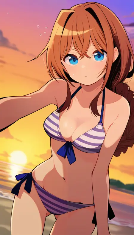 RikkaBikini, 1girl, blue eyes, brown hair, long hair, braided ponytail, hair intakes, sidelocks, hair between eyes, crossed bangs, hair over shoulder, medium breasts, swimsuit, striped bikini, halterneck, front-tie bikini top, side-tie bikini bottom, cleavage, bare shoulders, bare arms, ass visible through thighs