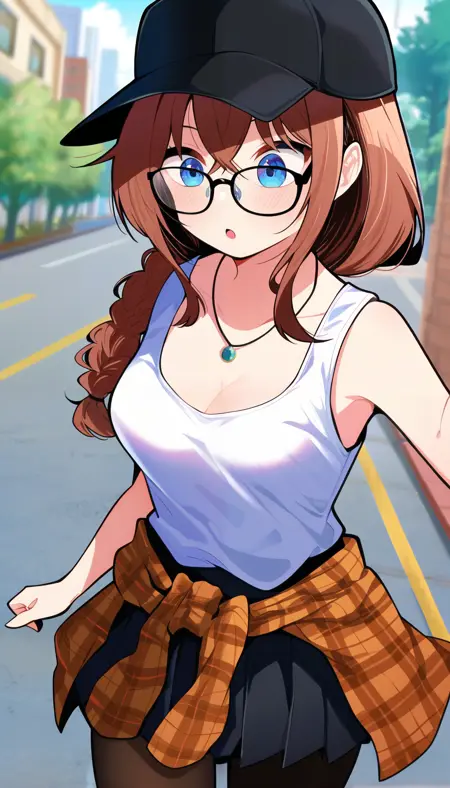 RikkaStreetwear, 1girl, blue eyes, brown hair, long hair, braided ponytail, hair intakes, sidelocks, hair between eyes, crossed bangs, hair over shoulder, medium breasts, hat, baseball cap, glasses, necklace, sleeveless, tank top, shirt tucked in, black skirt, plaid jacket, jacket around waist, black pantyhose, collarbone, cleavage