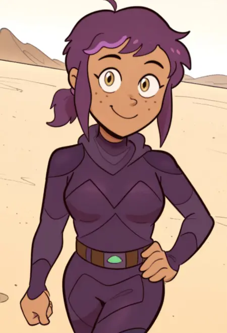 ベースプロンプト: Ayzee、薄い肌色、ほくろ、黄色い目、紫色に染めた髪