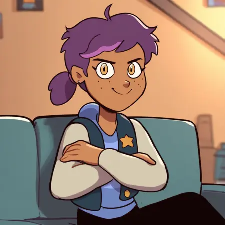 Base Prompt: Ayzee, light skin tone, freckles, yellow eyes, dyed-purple hair,