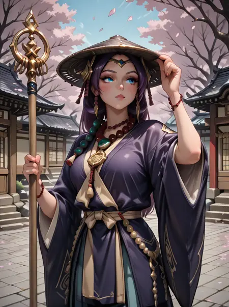 shakujo staff - long staff with metal rings looped through the headpiece. Makes a distinctive jingling sound when shaken
