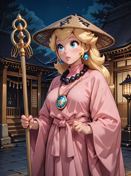 The LoRA is heavily influenced by the other styles in your generation, especially at low weight. This can produce some unintentionally neat effects, like Bowser having horns on his hat. When you get to about 0.8 or lower then some articles of clothing may start to be overriden by the character's normal clothing. For example, Princess Peach may start wearing a dress or crown instead of the monk attire.
