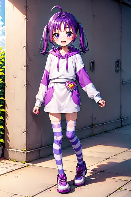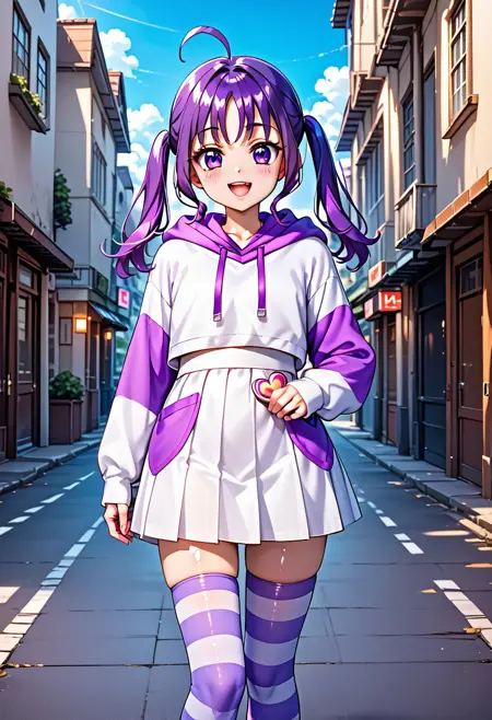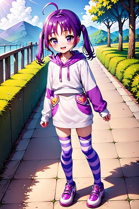 kokoro, 1个女孩, 单人, 条纹长筒袜, 双马尾, 紫色头发, 紫色眼睛, 连帽衫, 天线辫, 连帽, 全身, 紫色长筒袜, 看向观众, 鞋子, 长袖, 白色帽子, 白色裙子,