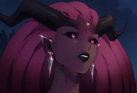 1girl, Drolta-Tzuentes-S2-V1.0, dark-skinned female, dark skin, pink hair, horns, earrings, jewelry, pointy ears, black lips, colored sclera, black sclera, pink eyes,