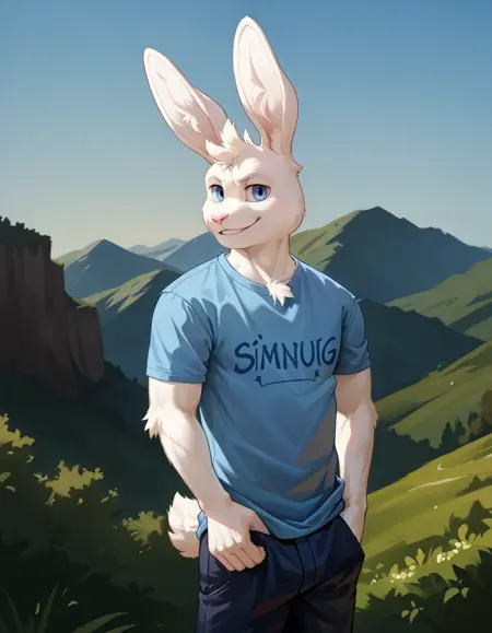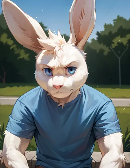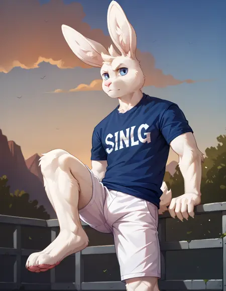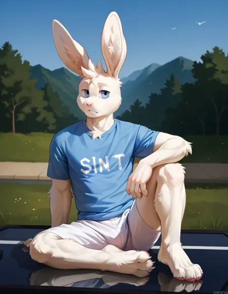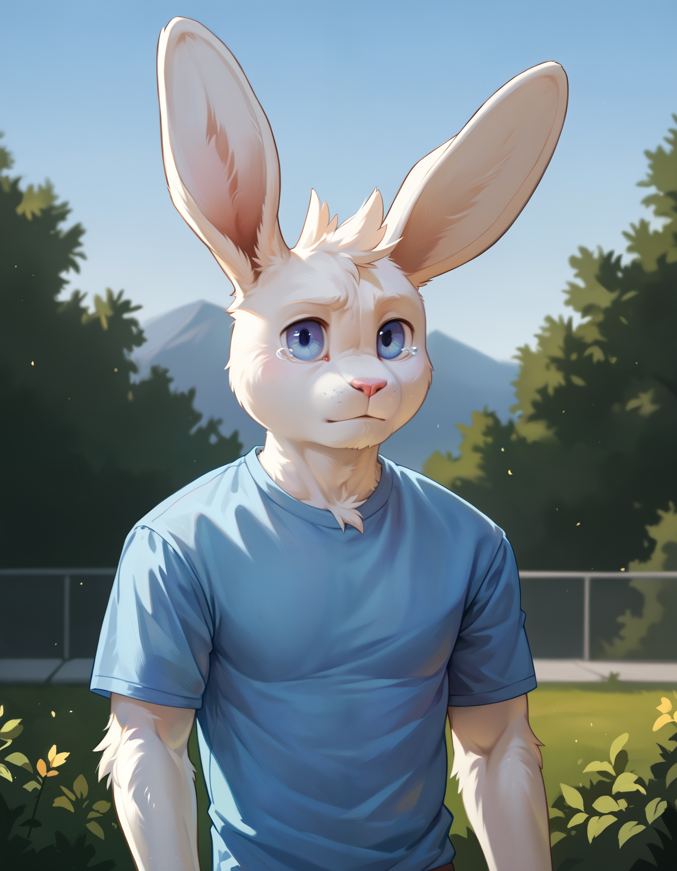 // Illustrious / Pony: sky_(i_think_i_like_you), furry, furry male, animal ears, rabbit ears, white fur, shirt, tail, rabbit tail, blue eyes, t-shirt, shorts