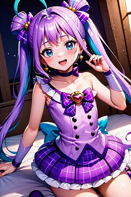 kyun, 1girl, solo, jewelry, twintails, long hair, purple hair, multicolored hair, purple bow, bow, purple thighhighs, dress, purple footwear, very long hair, purple dress, earrings, boots,