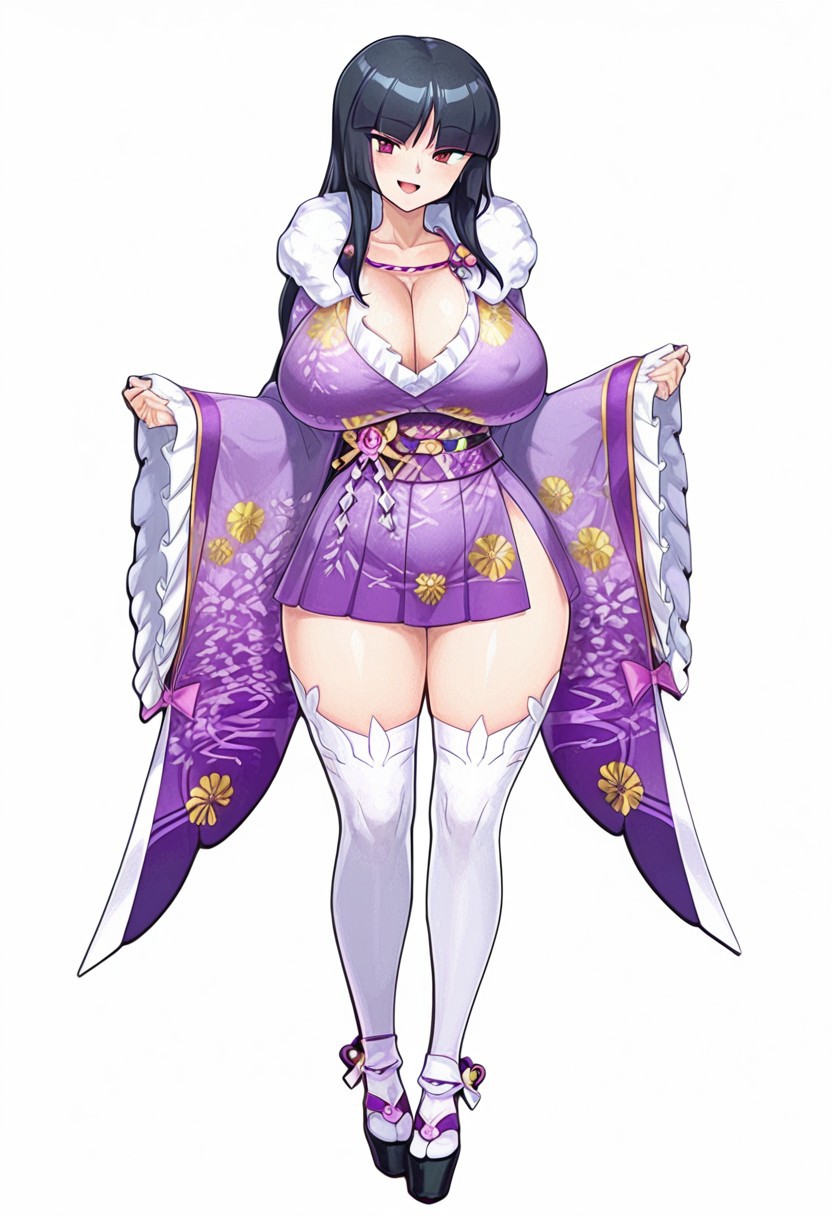 タグ:着物、日本の衣装、広袖、花柄、絶対領域、着物スカート、フリル付き着物、紫の着物、短い着物、胸元、白いタイツ、帯、サッシュ、プラットフォームシューズ