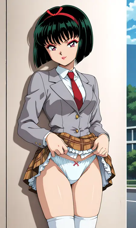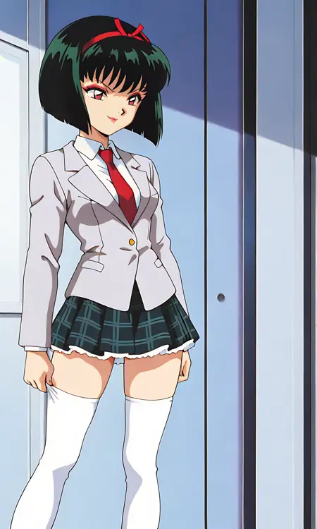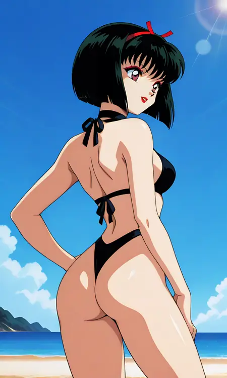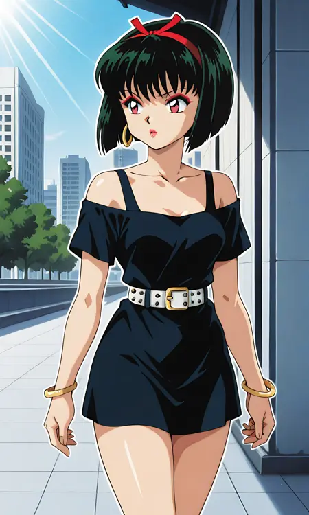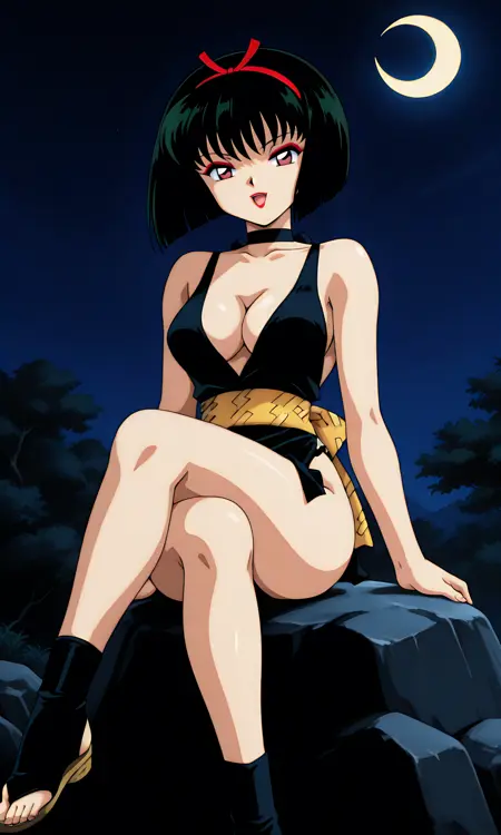 1990年代(スタイル)、アニメ風カラーリング、アウトライン、由羅坂上、ボブカット、ヘアバンド、赤い唇、赤いアイシャドウ、チョーカー、黄色い帯、黒いドレス、和風衣装、深い胸元、サイドスリット、太もも、ダイナミックなポーズ、誘惑的な笑み