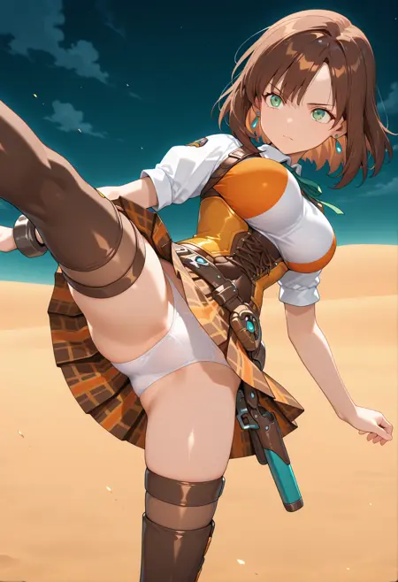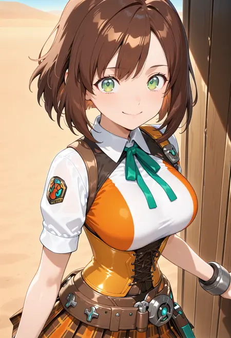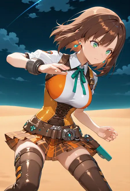white shirt, orange shirt, multicolored shirt, short sleeves, sleeves rolled up, green neck ribbon, corset, underbust, single wristband, belt, holster, miniskirt, plaid skirt, pleated skirt, thighhighs, zettai ryouiki, boots,