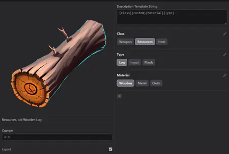 2 - Information about the selected image. Full description and a field for a unique description {custom} for each image. There's also an "Export" checkbox that determines whether the image will be exported or not.