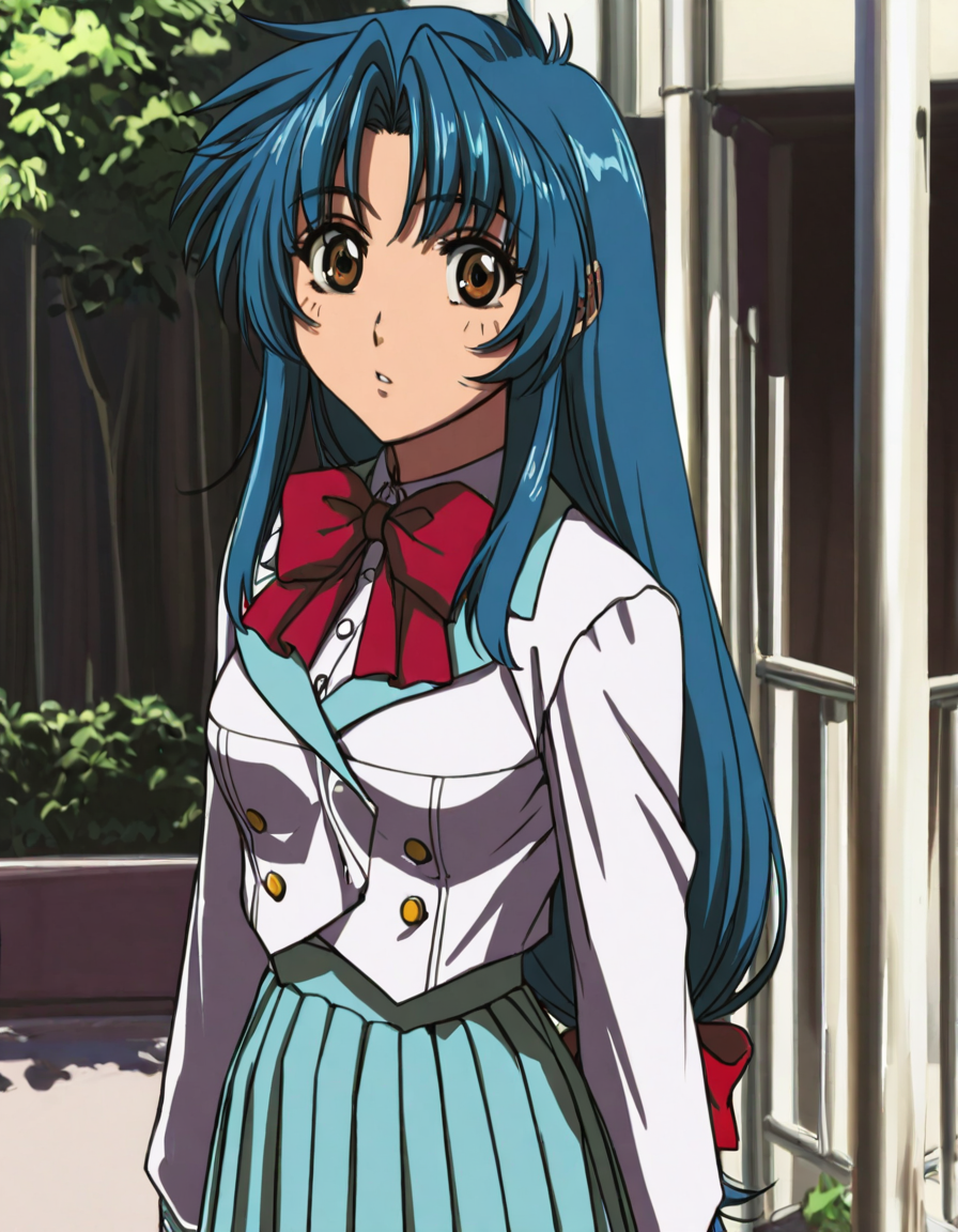 기본: fmpS1ChidoriKaname,1girl,solo,blue hair,brown eyes,low-tied long hair,hair ribbon,red ribbon,